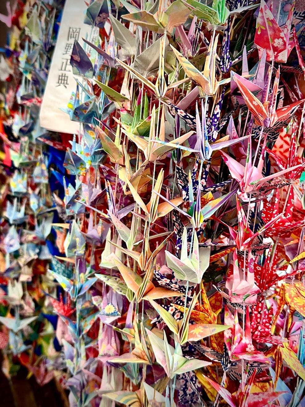 There’s a small perspex case in the Hiroshima Peace Museum, it contains some of the paper cranes folded by Sadako Sasaki, a young girl who survived the initial bomb blast on August 6th 1945, becoming one of Japan’s hibakusha, but who would die of radiation acquired leukemia in 1955 at the age of twelve. The crane (orizuru) is a mystical creature in Japan, associated with longevity and good fortune, legend holds that whoever folds 1,000 paper cranes will have their wish granted. Origami, or paper folding, was a popular pastime in hospital wards and a few weeks before her death, Sadako began her quest to fold one thousand cranes using whatever paper she could find. The cranes in the perspex case include ones folded from the papers that wrapped her medicines. They are tiny, much smaller than the ones I would later make back home, Sadako using a needle to form some of the folds.