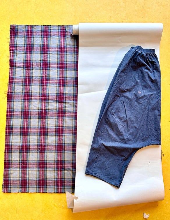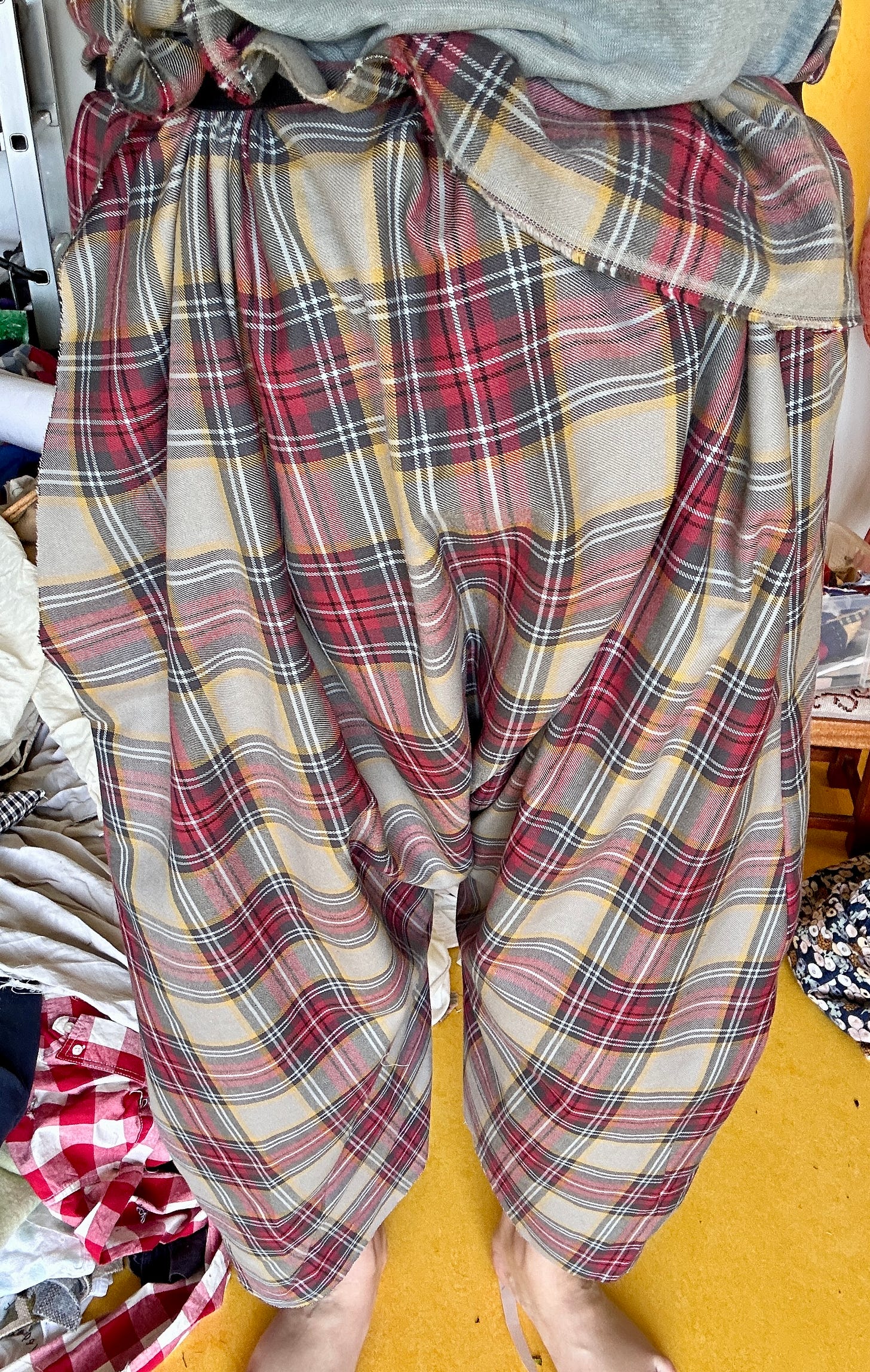 Charlie’s liberating ‘whatifness’ settled with me as I readied myself for a long-awaited trip to Japan, my head filled with thoughts of a capsule wardrobe (yes, I am laughing at myself). I wanted another pair of trousers, a warmer version of the grey pair I’d worn all summer. A smooth length of brushed cotton plaid, bought in a big birthday gift spending spree at Cloth House, called my name. I need to make it clear here that I’m a very poor dressmaker. No paper pattern to hand and little enthusiasm for that sort of making. My dress making is of a different kind and feels long forgotten, if not lost. It is a making born of school and church hall jumble sales, armfuls of fabulous stuff for 50p. A cardigan worn back to front, a sweater reduced to a tank top, a dress cut down to a skirt and fastened with a giant safety pin, and just once, a shirt worn as trousers. I wish I had visual evidence to share. Move on many years, and I really did fancy wearing my imagined bohemian plaid trousers, enjoyed the fantasy of resurrecting my early eighties garb. How to make it happen? And then Charlie’s ‘whatifness’ appeared to me as, ‘What if I just drew around the grey pair?’ I’d like to claim what follows as a self-drafted pattern, but it’s really not that expert.