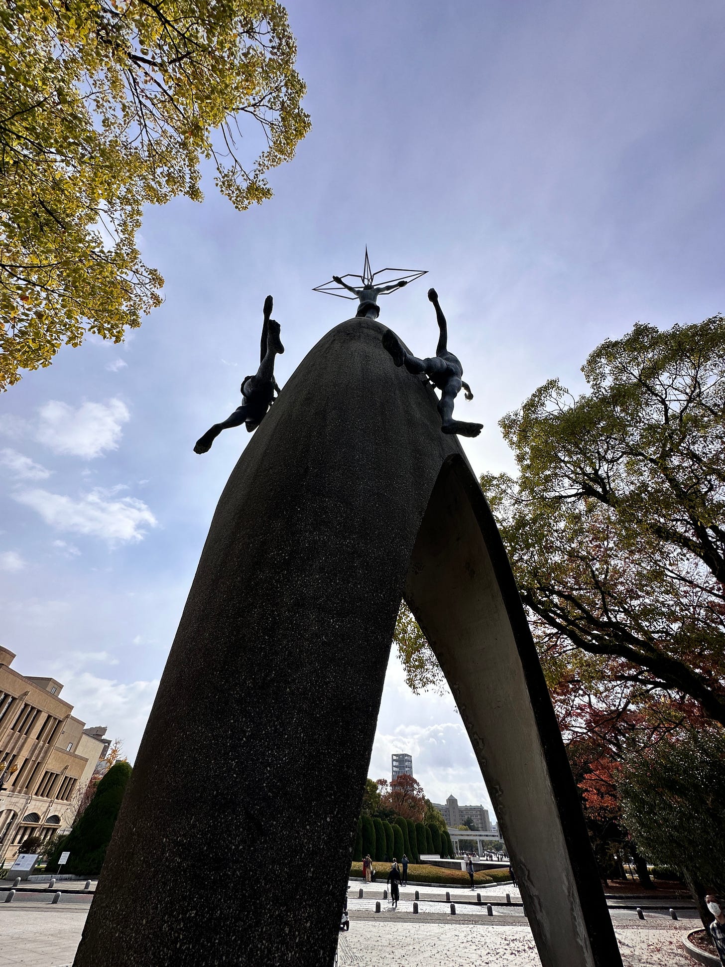 Towards Hiroshima: Staying with the ‘frayed edges of love and destruction’, I want to share something of my visit to Hiroshima, specifically its Peace Park. I grew up with stories of the Hiroshima and Nagasaki atomic bombs and anticipated an emotional visit, what I hadn’t expected was that this area – the epicentre of the A-Bomb attack – would be so beautiful and compelling. It feels odd to describe a site of such appalling destruction in these terms, and yet I spent many hours of our four-day visit there walking, sitting, reflecting, enjoying the blue skies and autumn leaves.