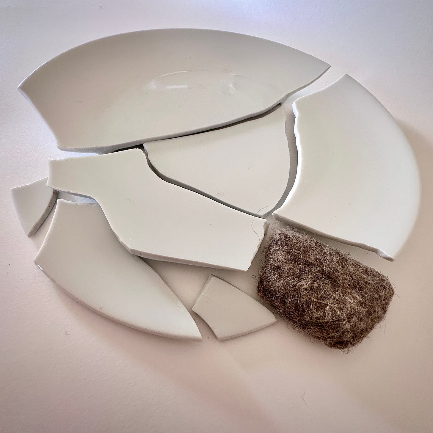 I knew, the moment I read the second email, that I would not be disposing of this plate, carefully or otherwise. Conversely, I found myself caring for it, wrapping the broken shards in tissue paper and boxing them up. A few days later I wrapped one of the fragments in wool fleece, which I began to felt. I did need to take care at this point, hand felting requires gentle rubbing of fleece fibres against each other, this sort of making is all fingers, thumbs and palms, and the edges of broken ceramics are very sharp. Felting one shard took all morning, and I really did enjoy it. I’d like to say that three years on, the remaining shards are similarly wrapped, but they’re not, somewhere along the way I lost the thread and some other interest took their place. Except that writing about them has returned me to them, literally. A quick hurry to the studio confirms I still have them, though minus one shard, and there’s plenty of fleece. I claim this moment as a perfect example of how writing nourishes practice, let’s see where this goes. And, is there anything more ludicrous than mending a broken plate with felt?