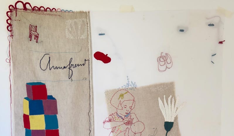 Similarly ‘lost for words’, I also turned to cloth and thread. A stretch of worn cotton, torn from a much larger bedsheet - something I’ve come to think of as my cloth sketch book - unwittingly became my winter companion. I’ve described this as my ‘working outs’, a nod to my experience of not being good at maths and how I was encouraged to show all my working out, as if this might compensate for never quite getting there. I am still working things out. The actual ideas I’m working through belong to an on-going project about Anna Freud and the Hampstead war nurseries. I’d leaned heavily into words at the start of the project, using metaphors around seaming, folding and joining to explore Anna’s working relationship with her father, and now lost for them, I was at a standstill. This is when I returned to the ‘whatifness’ I explored after reading Charlie Porter’s Bring No Clothes in chapter 3. What if I just start stitching? What if I try not to think too deeply about where this is going? Rip off a strip, thread a needle, start stitching.