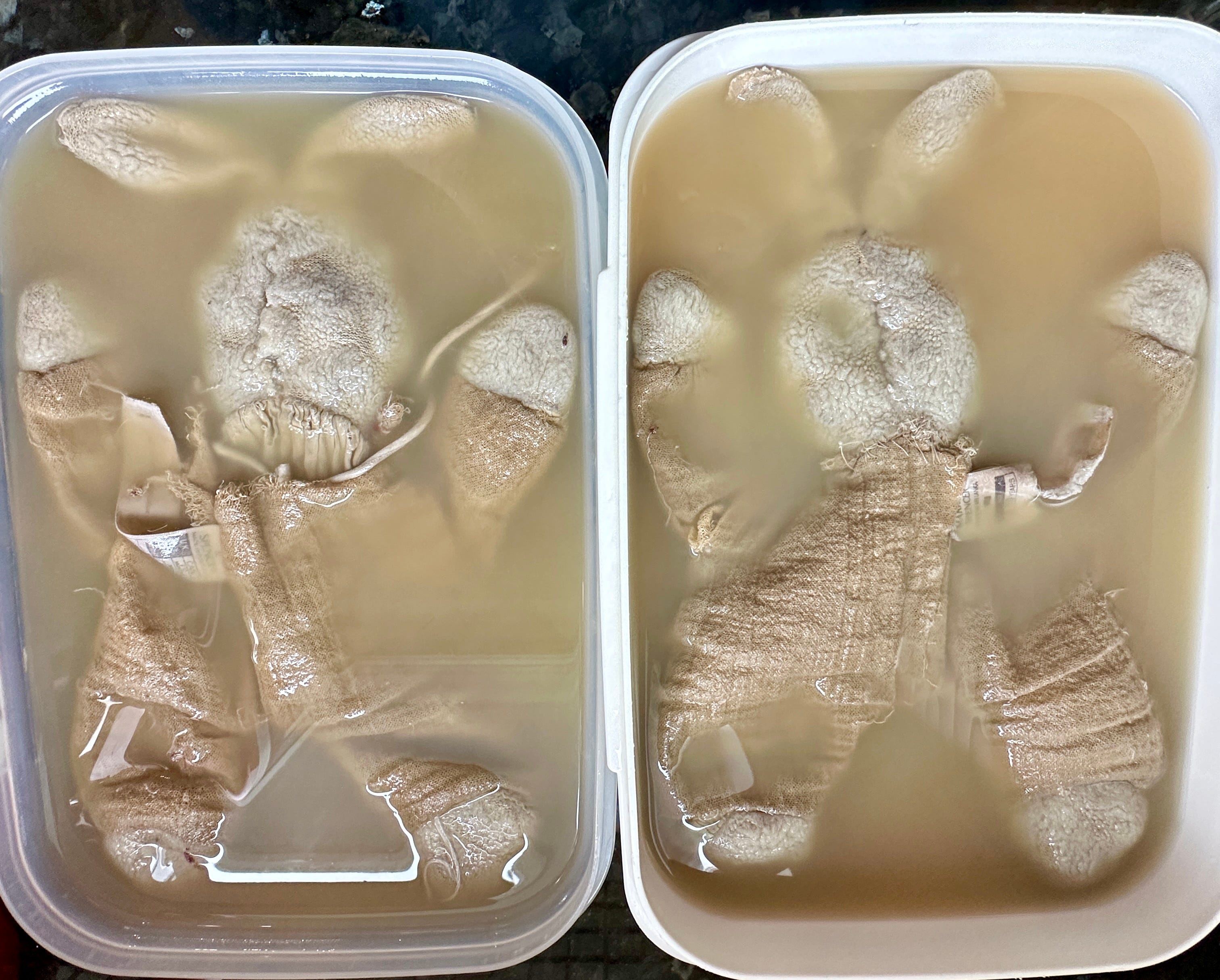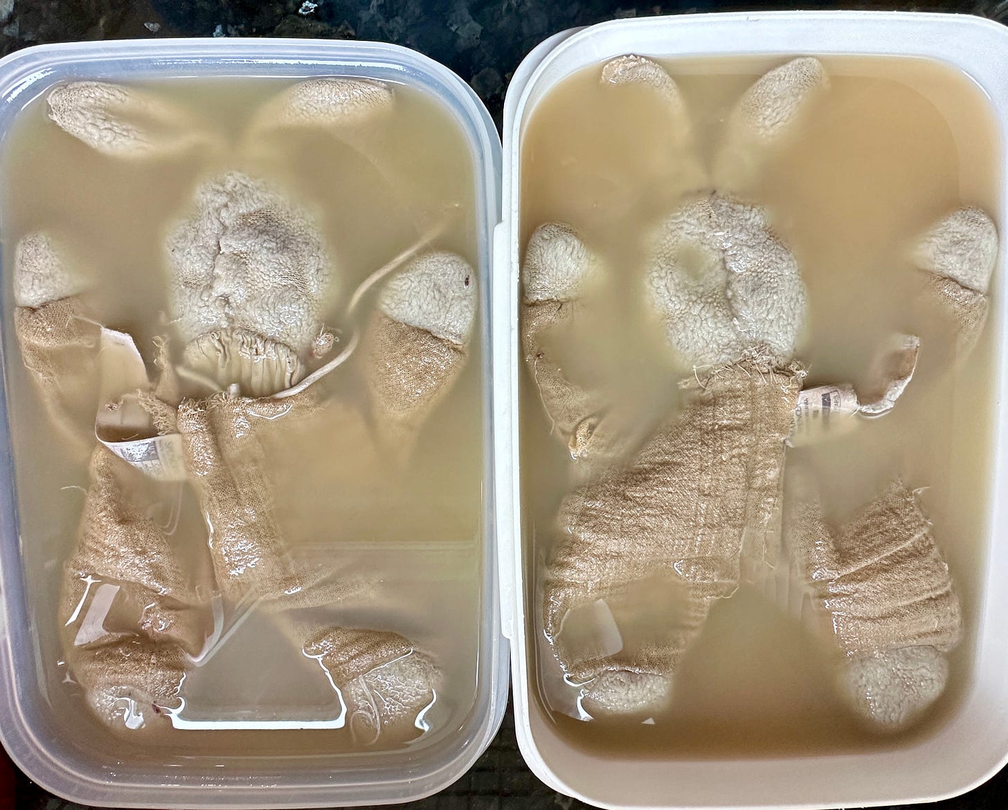 I make small loops to replace the areas of worn out plush, new work covering old ground. Starting at the face, then ears and paws. I’m reminded of gardening, of reseeding. John - this rabbit - has a twin, Peter. Known collectively as The White Rabbits they belong to Sarah-Joy Ford and I am mending their love worn bodies for her upcoming exhibition Rabbit at Bury Art Museum. They’ve come a long way before this reseeding stage. Beginning with their handover at Manchester’s Whitworth Art Gallery, a rucksack stashed train journey to Swansea and something approaching a forensic assessment of damage by me. The removal of their compacted stuffing; torso, limbs and head, all retained in individually sealed bags. Four baths in conservation grade detergent and a slow drying out. Half way there. Half way to go. My unthwarted optimism.