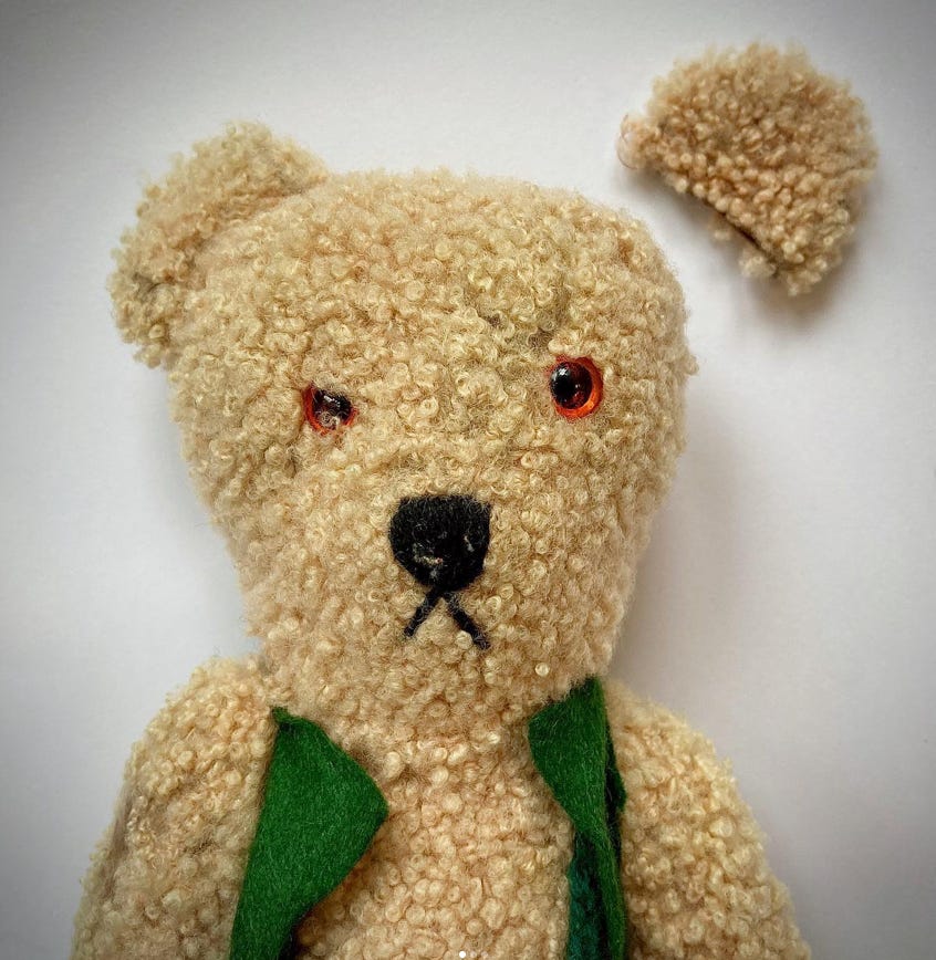 After talking, I turn to looking. This stage comes before the opening up. I’ll spend time holding and turning, teasing apart seams, checking for damage. Often, I’ll chance upon evidence of previous repairs, stitches made by younger, and sometimes less experienced, hands. Lovely big stitches, with a real sense of purpose. Occasionally, the interventions of someone long since gone. In both, my tendency is to retain rather than remove. This is so with Peter and John, where earlier repairs, by Sarah-Joy’s mum, remain.